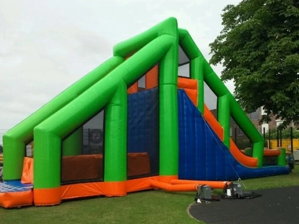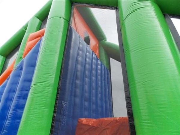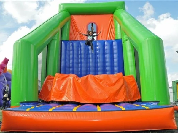 Klim op deze Base Jump aan de achterzijde op de enorme trap, eenmaal boven geniet je van een mooi uitzicht op 6 meter hoogte. Maak de sprong en kom even helemaal los. Deze vrije val wordt beneden gebroken door een heerlijk zacht bed van opblaasbare pilaren met een valdoek.
