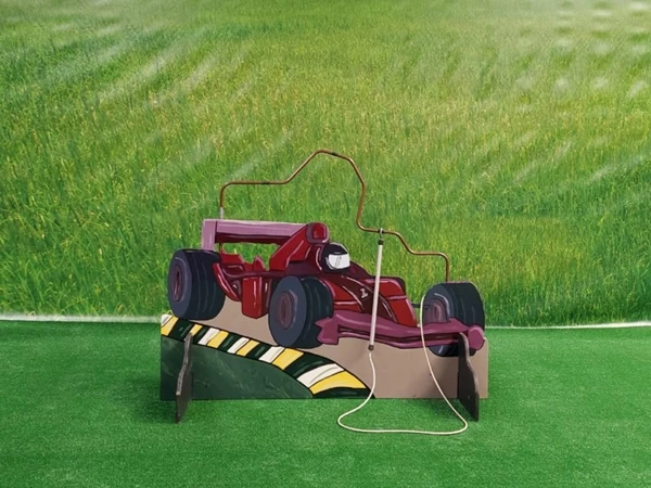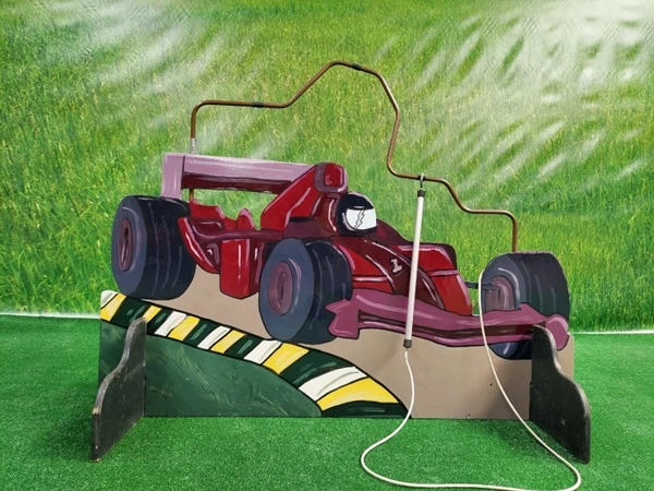 Bibber Spiraal Racewagen, probeer zonder het spel aan te raken het stokje naar de andere kant van het spel te krijgen. Bij aanraking gaat de bel en moet je weer vanaf het begin opnieuw starten.