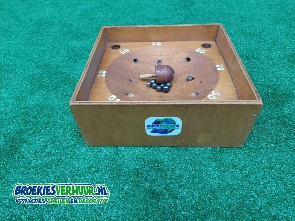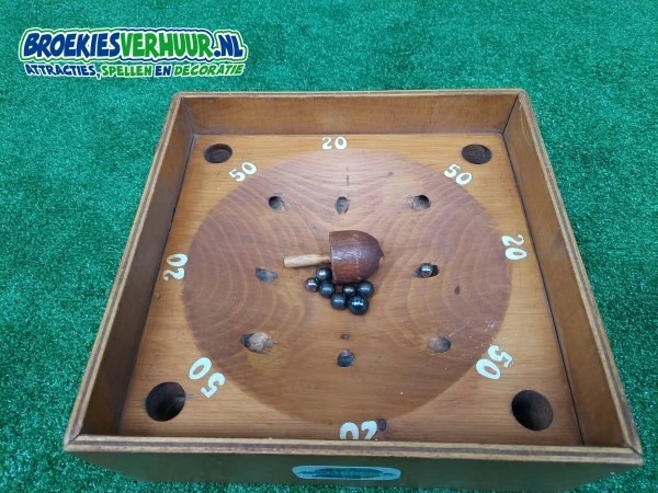 Bij dit Oud Hollandse spel worden balletjes in de bak gelegd. Met behulp van de tol moeten de balletjes in de gaten moeten worden getikt