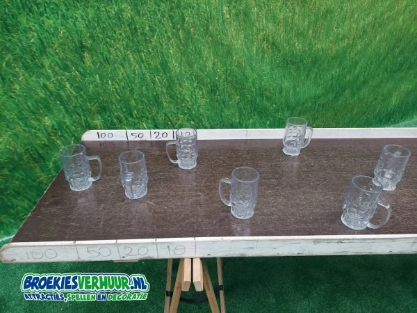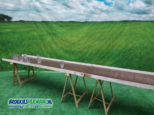 Probeer zoveel mogelijk punten te scoren door de bierpullen over de 5 meter lange baan te schuiven.... Maar pas op, indien je te hard schuift vallen de bierpullen van de baan.
