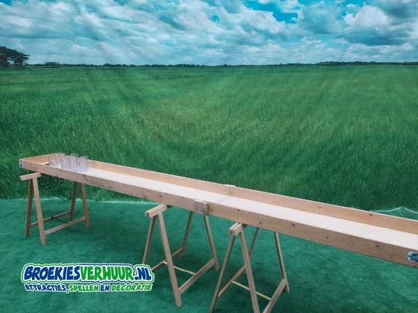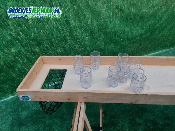 Probeer zoveel mogelijk punten te scoren door de bierpullen over de 5 meter lange baan te schuiven.... Maar pas op, indien je te hard schuift vallen de bierpullen in het net.