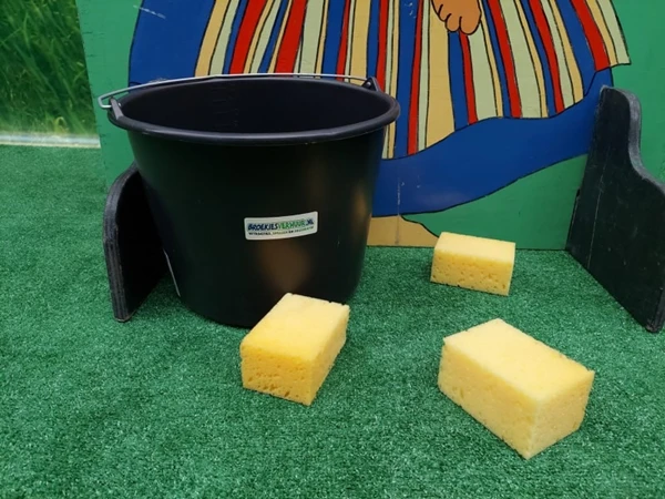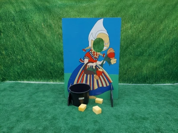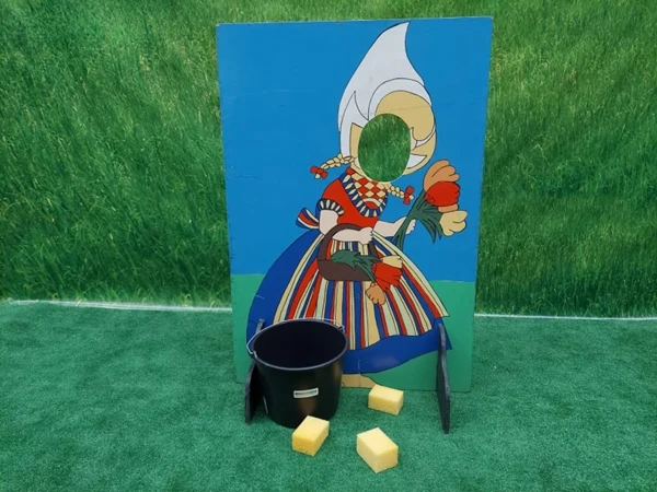 Boerin Spons Gooien, Iemand steekt zijn hoofd door het gat in het spelbord en de anderen moete proberen zijn of haar hoofd te raken met de bijgeleverde sponzen.