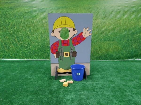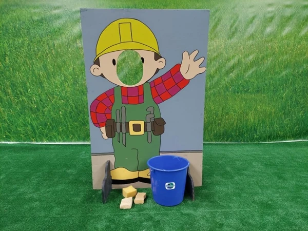 Bouwvakker Spons Gooien, Een deelnemer steekt zijn hoofd door het gat in het spelbord, de tegenstander probeerd zijn hoofd te raken met een van de bijgeleverde sponzen.