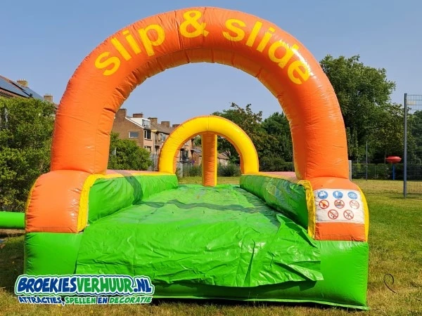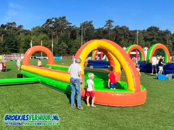 Speciaal voor de zomermaanden hebben wij deze Buikglijbaan met plonsbad als waterattractie. Neem een aanloop en probeer zo ver mogelijk op de buik over deze buikglijbaan te glijden. aan het einde van de baan zit het zwembad. Deze Buikglijbaan met plonsbad is een leuk onderdeel van een sportieve zeskamp of andere activiteit.