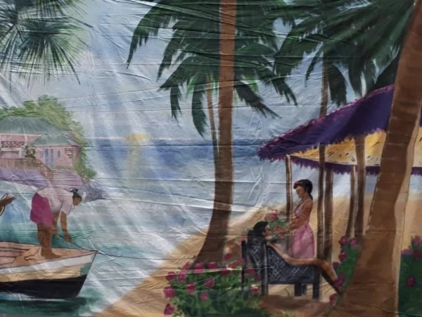 Decor Doek Caribisch Palmen, Huisje, Bootje 6 x 3 meter en past helemaal in het thema zomer of beach.
