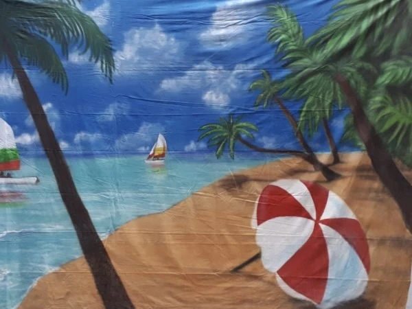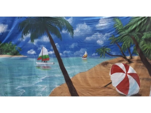 Decor Doek Caribisch Strand, Palm, Parasol 6 x 3 meter en past helemaal in het thema zomer of beach.