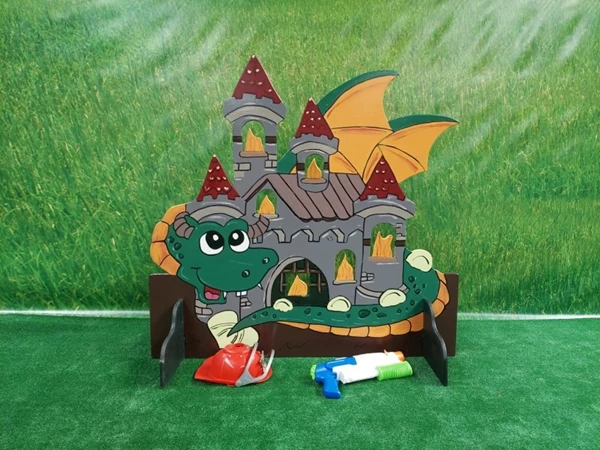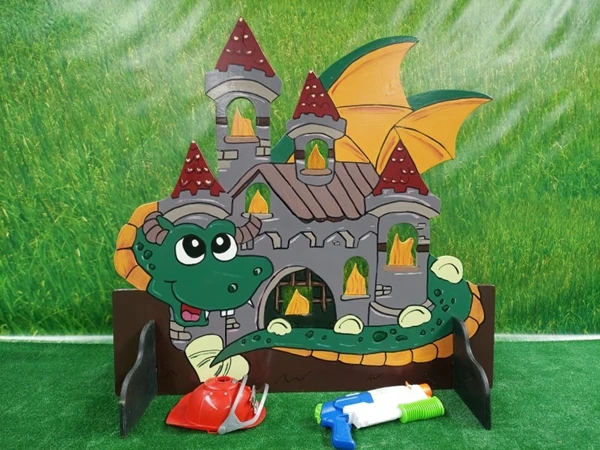 Draak Brandweer Spel, probeer de vlammen van dit spel omver te spuiten met de meegeleverde waterspuit.