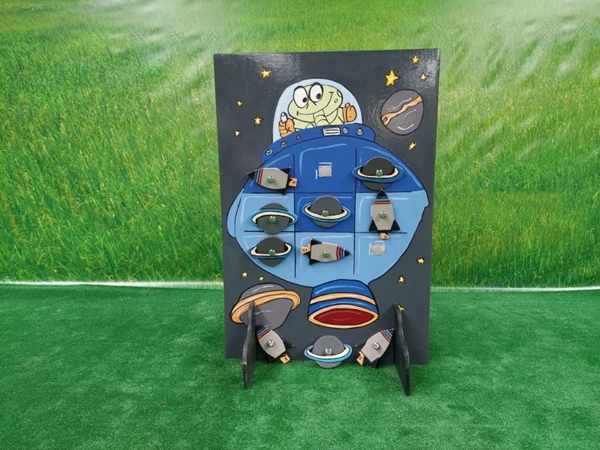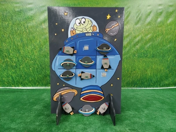Drie op een rij Space, probeer als eerste drie dezelfde figuren op een rij te krijgen. De figuren blijven gemakklijk kleven door het klittenband op het spel.