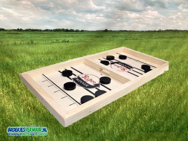 Deze Elastiek Sjoelen, ook wel Sling Shot genoemd is fantastisch om te spelen. Probeer zo snel mogelijk alle sjoelstenen op de zijde van de tegenspeler te krijgen.