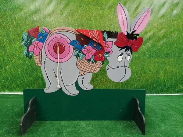 Ezeltje Prik, een spel wat veel wordt ingezet. probeer geblindoekt de staart van de ezel op de juiste plaats te prikken.