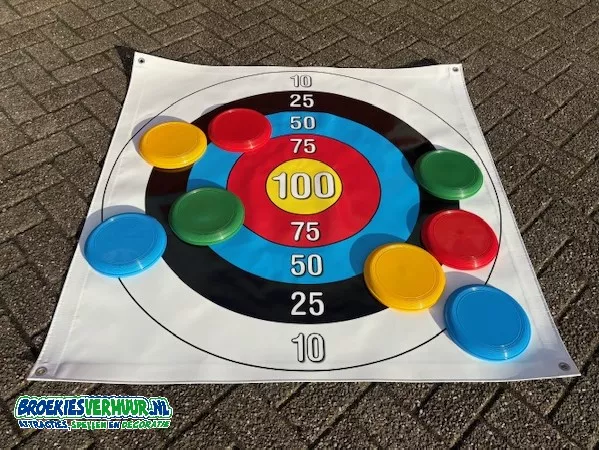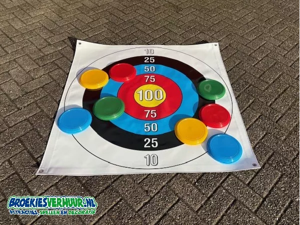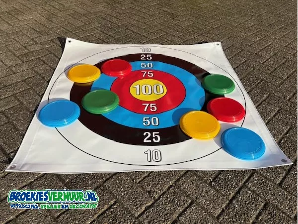 Hoe leuk is dat, een lekker potje Frisbee Werpen Small. Probeer de twee frisbees in jou favoriete kleur zo dicht mogelijk in het midden van het spelkleed te werpen. Frisbee Werpen Small speel je met 2, 3 of 4 personen tegelijkertijd. De Frisbees worden dan ook geleverd in vier verschillende kleuren.
