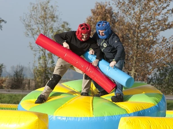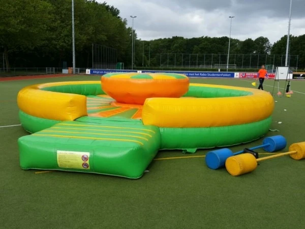 Deze Gooi em eraf mag tijdens uw sportieve activiteit absoluut niet ontbreken. Speel 1 tegen 1 en kijk wie het langste op het opblaasbare plateau van deze Gooi em eraf blijft staan. Gooi em eraf wordt compleet geleverd en is erg gemakkelijk op te bouwen. een erg leuke en sportieve attractie.