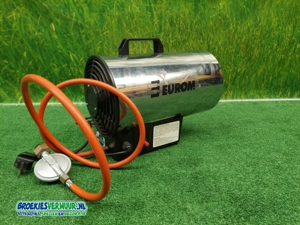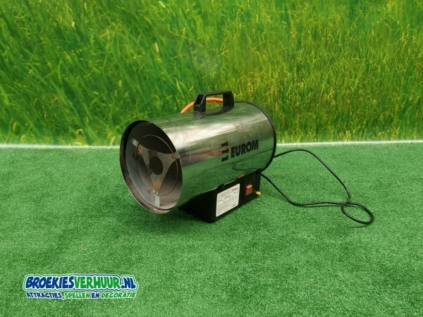 Hete lucht/warmte kanon op gas. Het heteluchtkanon heeft 14.800W vermogen en een luchtverplaatsing van 500m³ per uur.