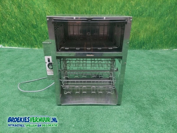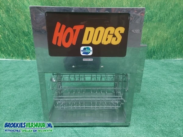 Onze Hotdog machine laat de hotdogs door de machine draaien terwijl ze ondertussen verwarmen. Leuk om naar te kijken maar nog lekkerder om de warme worsten om een broodje op te eten. Deze machine is natuurlijk los te huur, maar kan ook in combinatie met een leuke kraam. Indien u grotere hoeveelheden hotdogs in korte tijd wil verwarmen adviseren wij om de speciale worsten warmer als extra artikel bij te bestellen.