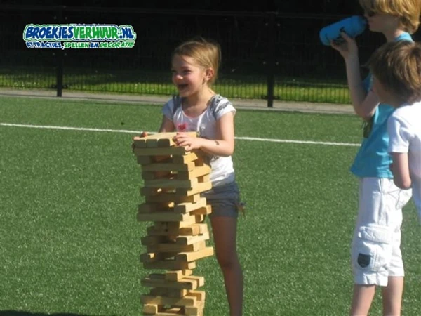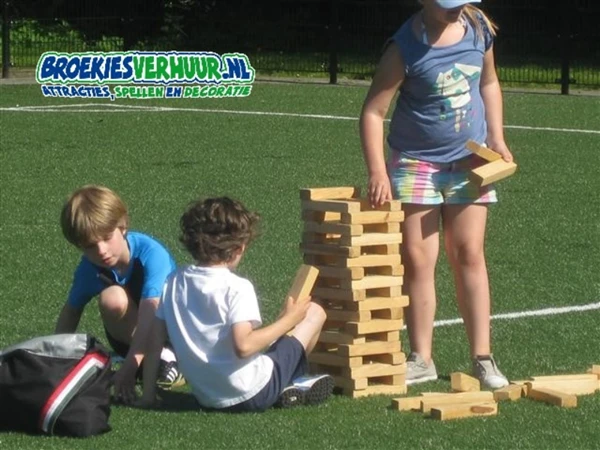 Jenga XXL, een spel voor jong en oud. Probeer voorzichtig een blok onder uit de stapel te pakken en plaats deze weer aan de bovenzijde van de toren, maar pas op dat de toren niet gaat instorten. Een echt behendigheidspel.