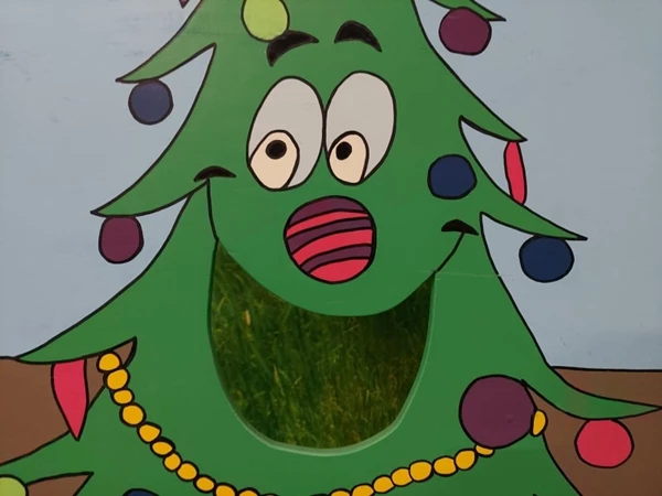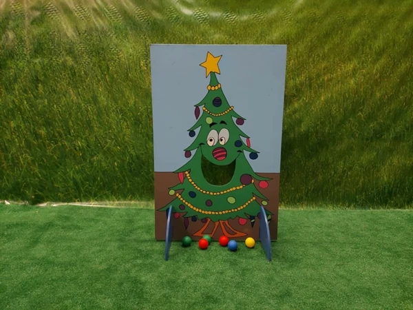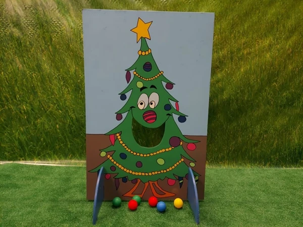 Kerstbal Gooien, probeer zoveel mogelijk kerstballen door het gat in de kerstboom te gooien.