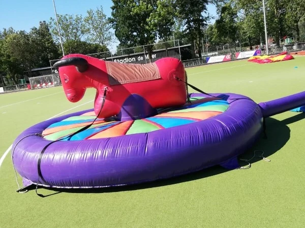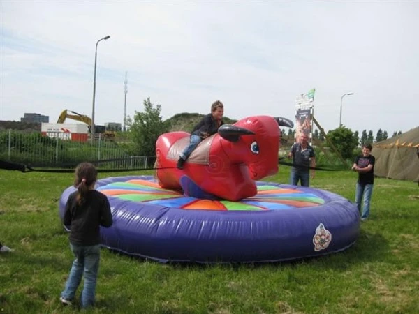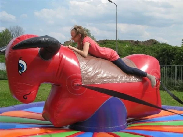 Een bijzonder leuke attractie voor de kinderen is onze Kinder rodeo stier. Neem plaats op de stier, en deze zal gaan bewegen net zo lang tot jij het volhoud en van de stier afvalt. Deze opblaasbare Kinder rodeo stier beweegt door de 4 trekbanden aan de zijkanten, en worden bediend door 4 kinderen of volwassenen. Veilig en erg leuk om te doen.