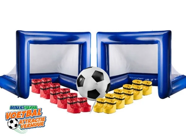 Hilarisch, Klein Duimpje Voetbal van Broekiesverhuur.nl Een fantastisch voetbal spel waarbij alle deelnemers met een paar mega grote voetbalschoenen, waarbij iedereen zich al snel een Klein Duimpje voelt, een partijtje voetbal speelt. Klein Duimpje Voatbal wordt compleet geleverd inclusief twee groete doeltjes en een mega voetbal. Tijd voor een echt voetbal feestje voor jong en oud.