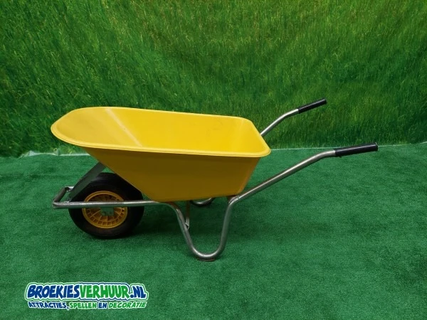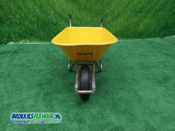 Een deelnemer neemt plaats in de kruiwagen, terwijl de tweede deelnemer de kruiwagen zal besturen over het parcours.