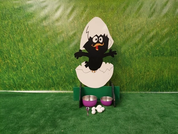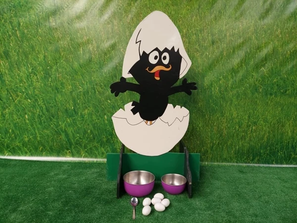 Kuiken Eieren Race, probeer zoveel mogelijk eieren op de lepel over te brengen, maar pas op. De eieren mogen onderweg natuurlijk niet van de lepen afvallen. Dit spel kan door twee personen tegelijkertijd worden gespeeld.