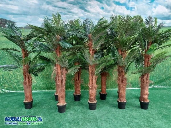 Volle stevige kokos kunstpalm 180cm met meerdere stammen omwikkeld met stevige kokosvezels. Deze 180 cm hoge kunstpalm is voorzien van 4 stevige donker bruine kokosstammetjes en vier volle groene blad rozetten. De bladrozetten zitten op verschillende hoogte waardoor het een zeer goedgevulde boom is Deze palm is zeer geschikt om een tropische sfeer te creëren in een horeca gelegeheid, strandtent, café, zithoek of gewoon in huis.