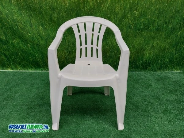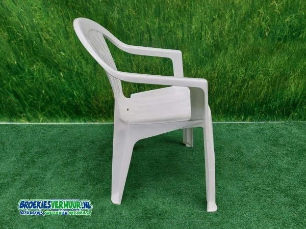 Onze Kunststof stapelstoel met armleuning heeft hoekjes op de poten zodat deze niet wegzakken in het gras. Niemand hoeft te blijven staan, want wij hebben altijd genoeg stoelen in voorraad.