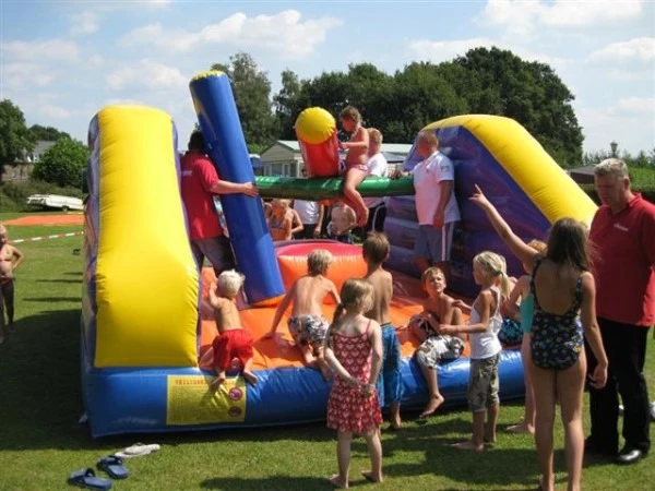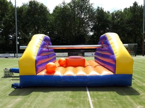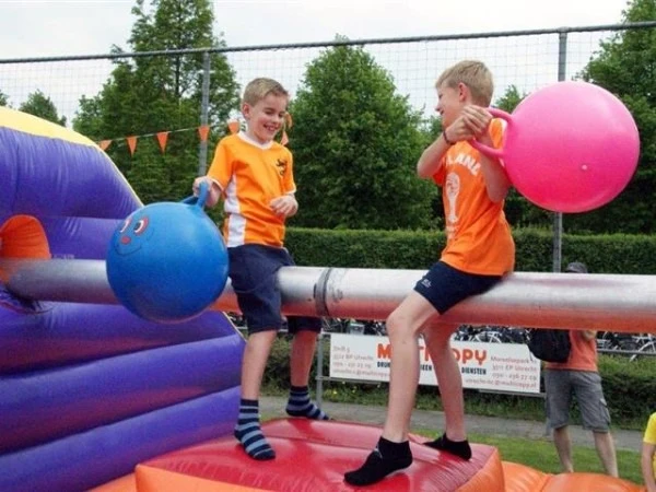 Kent u deze attracties misschien onder de naam zak slaan? wij noemen hem al jaren Kussengevecht. Deze attractie bestaat uit een opbaalbaar ondertsel waarin de meegeleverde balk kan worden geschoven. twee deelnemers nemen plaats op de balk van het Kussengevecht, en proberen elkaar van de balk af te werpen. Leuk om te doen, maar zeker ook om naar te kijken.