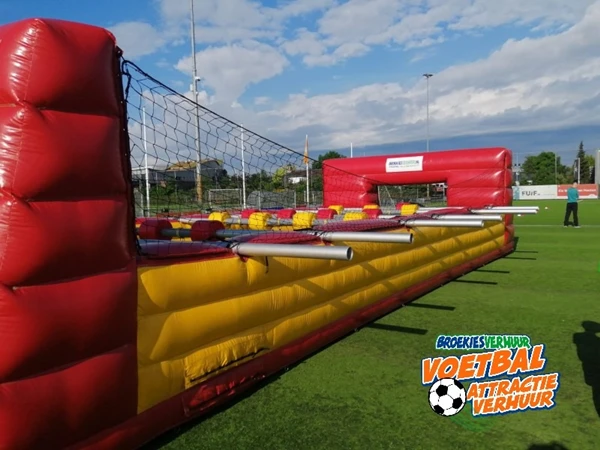 Een fantastisch leuk teamspel dit Levend tafelvoetbal groot. Speel 6 tegen 6 Levend tafelvoetbal groot en maak een echte competitie. Wij hebben meerdere Levend tafelvoetbal spellen in voorraad, dus indien de groep deelnemers erg groot is kunnen meerdere teams tegelijkertijd spelen. Elke deelnemer zit met een gordel vast aan de verschillende palen van dit spel, en kunnen alleen maar naar links of rechts bewegen. Ook voor toeschouwers erg leuk om naar te kijken.
