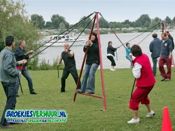Ook weer zo'n leuk spel waarbij samenwerking centraal staat. In de Lopende A gaat 1 persoon staan, de Lopende A moet zo snel mogelijk naar de overkant doormiddel van de vier touwen te gebruiken met vier personen.