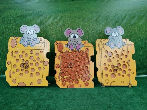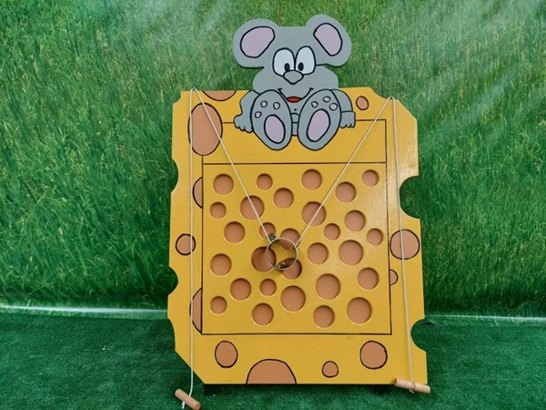 Mega Gatenkaas, probeer met de knikker van onderaan het spel een pad te volgen naar boven. Maar let op, de knikker mag niet verwijnen in de gaten van de kaas. Een echt behendigheidsspel.