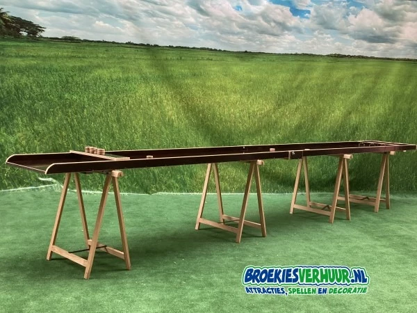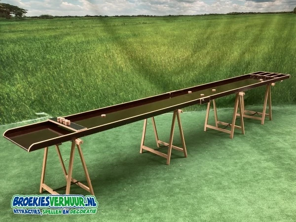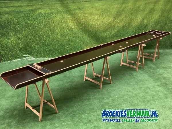 LET OP: deze Sjoelbak bestaad uit twee delen van 2.5 meter lang inclusief 4 schragen.