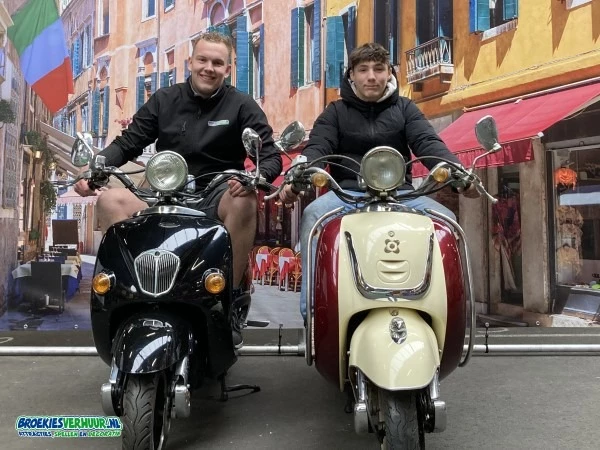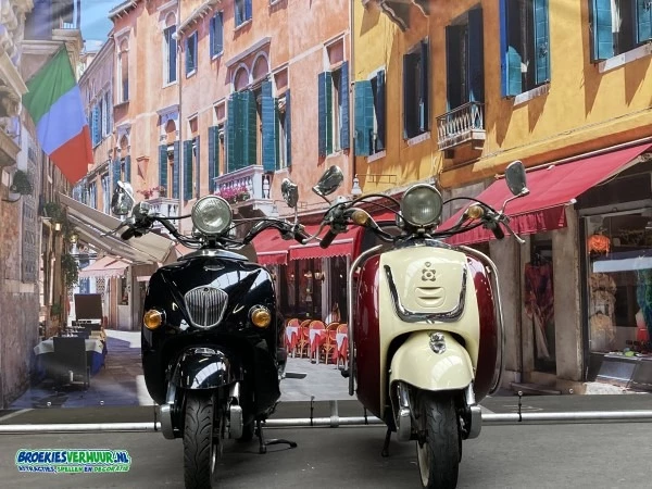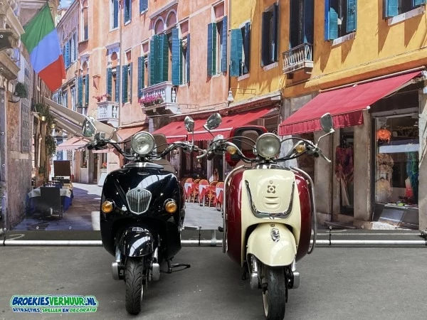 Deze setting bestaat uit een decordoek, aluminium frame en natuurlijk de 2 orginele Retro Scooters welke plaats bied aan 2 tot 4 personen voor de allerleukste foto.