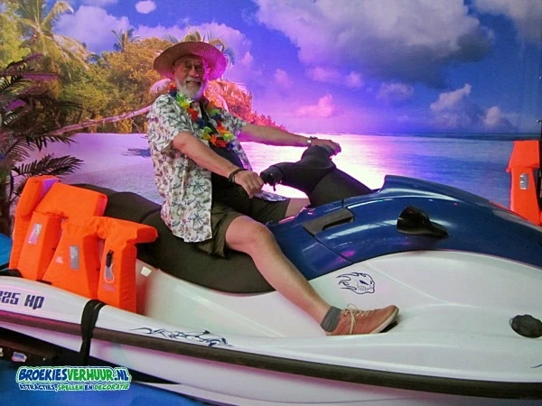 Deze setting bestaat uit een decorframe, tropisch doek, watertapijt, zwemvesten, boeien en natuurlijk de originlee Waterscooter welke plaats biedt aan wel 3 personen voor de allerleukste foto.