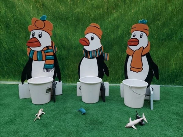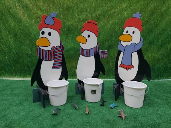 Pinquins Voeren, probeer zo veel mogelijk visjes te voeren aan de pinquins dppr deze in de emmers te werpen.