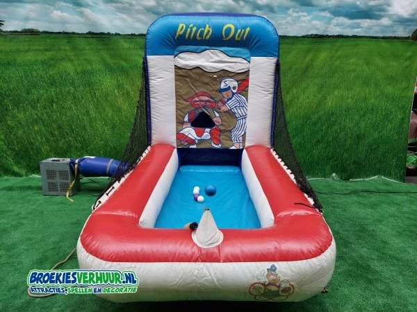 Pitch out behoort tot een van de vier opblaasbare spellen uit een serie. Probeer de bal met de bijgeleverde honkbalknuppel in het juiste gat te slaan. Eigenlijk dus gewoon een leuke vorm van honkballen. de bal wordt bij Pitch out omhoog gehouden door lucht die omhoog wordt gebazen.