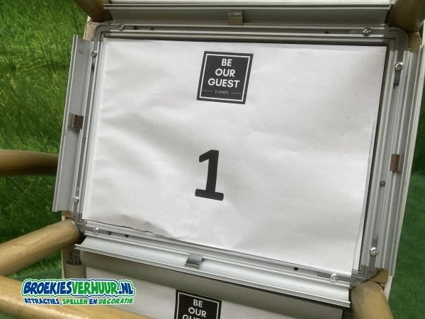 Uniek in Nederland, het allergrootste Rad van Fortuin XXL in Nederland is exclusief te huur bij Broekiesverhuur.nl. Een fantastisch rad voor een beurs, bedrijfsevent, open dag of andere gelegenheid waar iets te winnen is. Dit enorme Rad van Fortuin XXL is heel eenvoudig te personaliseren doormiddel van teksten, cijfers, vragen of prijzen welke u zelf op een A4 kunt afdrukken. Bevestigen via de kliklijsten op het rad. Het rad heeft in totaal 20 verschillende vakken.