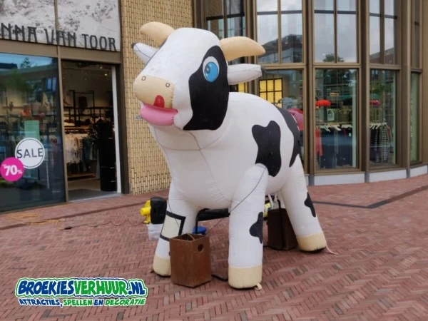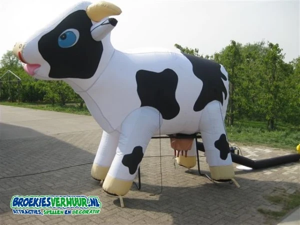 Hoe vet is dat, een mega grote Ranja Koe opblaasbaar Wit. Plaats de koe op het bijgeleverde frame, vul de emmer met ranja en zet de blower aan. De koe blaast zichtzelf helemaal op. Nu kunnen de kinderen op het krukje plaatsnemen en hun bekertje helemaal vol melken met ranja. Een superleuke attractie voor de kids om te doen maar minstens zo leuk al eyecatcher tijdens uw feestje of evenement.