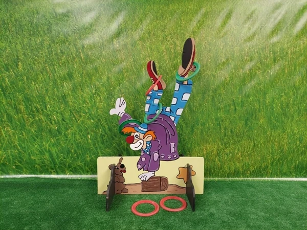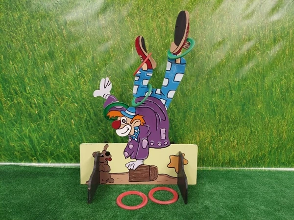 Ring Gooi Clown Handstand, probeer zoveel mogenlijk ringen om de voeten van de clown te werpen.