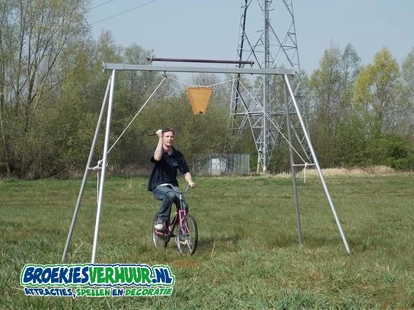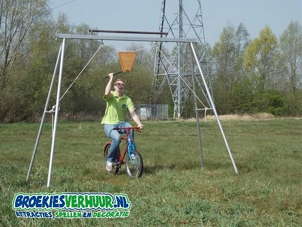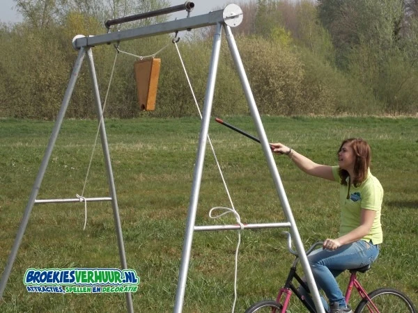 Ga op een fiets of skelter richting de stellage van het ring steken en verzamel in een vijftal pogingen zoveel mogelijk ringen.