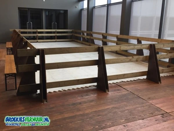 Wij plaatsen de schaatsbaan altijd op een houten vlondervloer welke bij de prijs is inbegrepen. Dit voor een zo vlak mogelijke schaatsvloer en om de bijgelerde houten boarding op vast te kunnen zetten. En dat is wel zo veilig. De vlondervloer is geen stelvloer of systeemvloer die hoogte verschil kan opvangen. Een systeemvloer kan optioneel worden aangeboden.