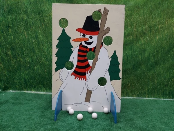 Sneeuwpop Ballen Gooien, Probeer zoveel mogelijk sneeuwballen door de gaten van dit spelbord te gooien.