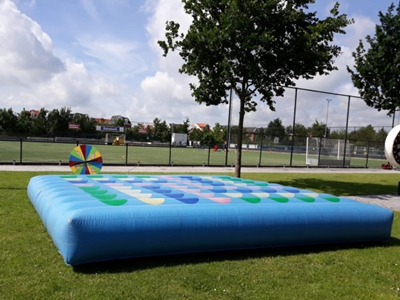Natuurlijk het allerbeste om te plaatsen op gras ondergrond zodat de attractie kan worden verankerd doormiddel van haringen/grondpennen. Is de ondergrond kunstgras of straatwerk? vergeet dan niet om voldoende betongewichten mee te bestellen om de baan op de juiste en enige manier veilig te kunnen plaatsen.