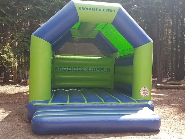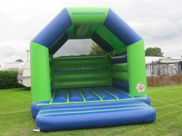 Springkussen Broekies groot is misschien wel ons meest bekende springkussen. Springkussen Broekies groot is voorzien van onze bedrijfsnaam en uitgevoerd in de bekende blauw en groene kleuren. Springkussen Broekies groot is voorzien van een dak, zodat de kinderen beschermd zijn tegen de zon en lichte regen.
