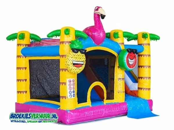Een superleuk springkussen Jumpy Happy Flamingo met glijbaan. Genoeg voor urenlang speelplezier voor de kids. Dit springkussen Jumpy Happy Party in erg geschikt om te plaatsen in eigen tuin.