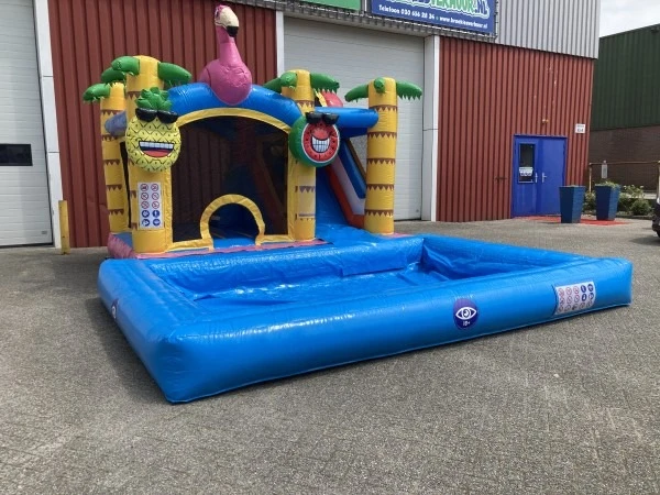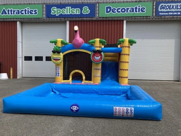 Een uniek springkussen met bijbehorend zwembad, deze Jumpy Happy Flamingo Splash met glijbaan. Heerlijk springen en tot slot via de glijbaan zo het zwembad in. Wat een feest. Voor de veiligheid plaatsen wij dit springkussen alleen op een zachte ondergrond zoals gras. Het springkussen en zwembad worden los geleverd, en kunnen eenvoudig met klittenband aan elkaar bevestigd worden.