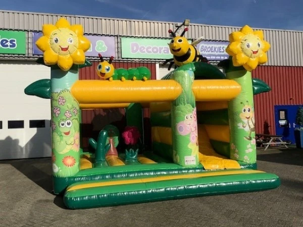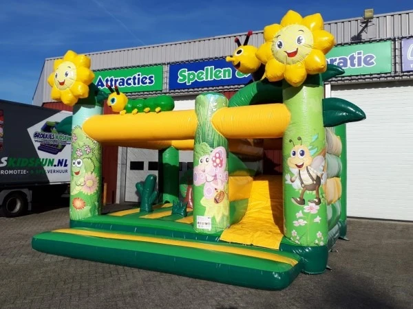 Nieuw in Nederland, Springkussen Multiplay BloemenTuin. Springkussen Multiplay BoemenTuin is een bijzonder en groot springkussen met veel extra's. Springussen Multiplay BloemenTuin is voorzien van extra speelopbjecten en een glijbaan. Deze Multiplay Bloementuin past niet in een standaard personenwagen maar alleen in een lege bestelwagen of aanhangwagen.