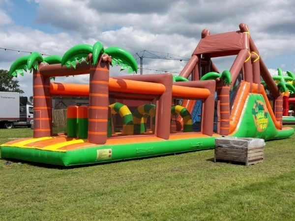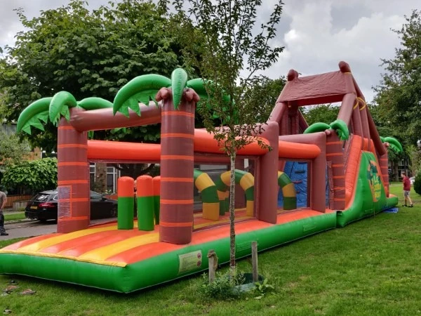 Deze geweldige hindernisbaan in Jungle thema, de Super jungle running is al jaren een van de meest verhuurde stormbanen uit ons assortiment. De Super jungle running is 17 meter lang, en heeft naast een aantal hindernissen ook een leuke klim en glijbaan. De Super jungle running is uitgevoerd met netten aan beide zijkanten dus beschikt over slechts 1 in en uitgang.