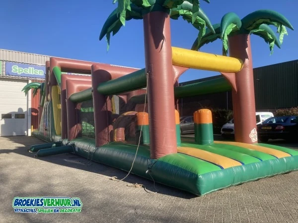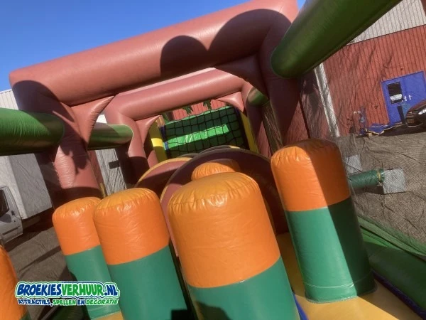 Deze geweldige hindernisbaan in Jungle thema, de Super jungle track is al jaren een van de meest verhuurde stormbanen uit ons assortiment. De Super jungle track is 17 meter lang, en heeft naast een aantal hindernissen ook een leuke klim en glijbaan. De Super jungle track is uitgevoerd met netten aan beide zijkanten dus beschikt over slechts 1 in en uitgang.
