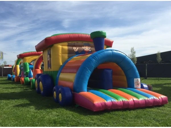 De locomotief van deze supertrein stormbaan Mega Fun Trein running trekt zijn wagons vol trots tijdens uw evenement.