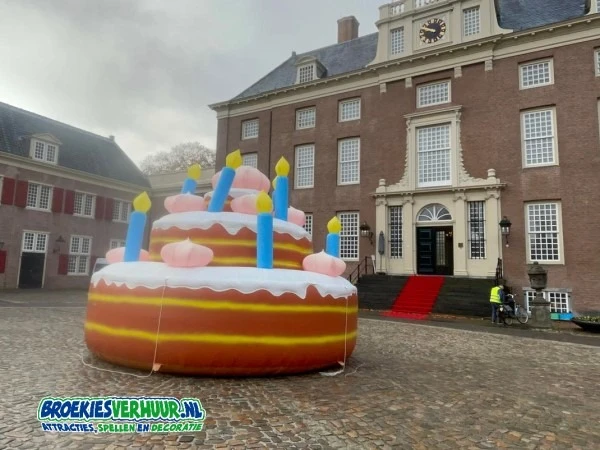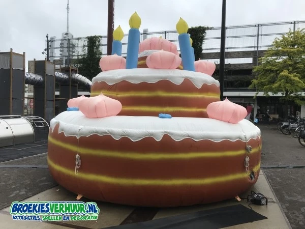 Wanneer er iets te vieren is, is er vaak ook een stukje taart bij. Dan kan nog veel gekker met deze enorme opblaasbare taart van maarliefst 5 meter doorsnee. Verjaardag, jubileum, opening, bruiloft de taart is bijna overal wel inzetbaar. Een leuke blikvanger waarover nog veel zal worden gesproken.